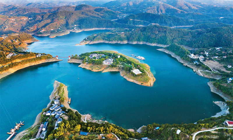 新时代以来,在习近平生态文明思想科学指引下,生态文明建设从理论到实践都发生了历史性、转折性、全局性变化,生态文明体制改革纵深推进,生态文明制度体系基本形成,生态环境质量持续改善。陕西省安康市多年来通过建立“河湖长制+志愿者”护河机制,扎实推进汉江水质保护工作,使汉江出境断面水质稳定保持国家地表水Ⅱ类标准。图为2024年11月2日拍摄的安康汉江瀛湖库区景色(无人机照片)。 新华社记者 邵瑞/摄